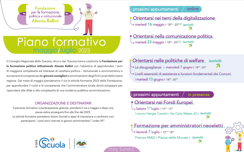 Entra nel vivo l’attività della “Fondazione per la formazione Politica e Istituzionale Alessia Ballini”, la scuola per i giovani consiglieri e amministratori della Toscana, nata per volontà del Consiglio regionale della Toscana con Anci Toscana e Upi Toscana ed intitolata all’indimenticata sindaca e assessora provinciale scomparsa prematuramente 10 anni fa.